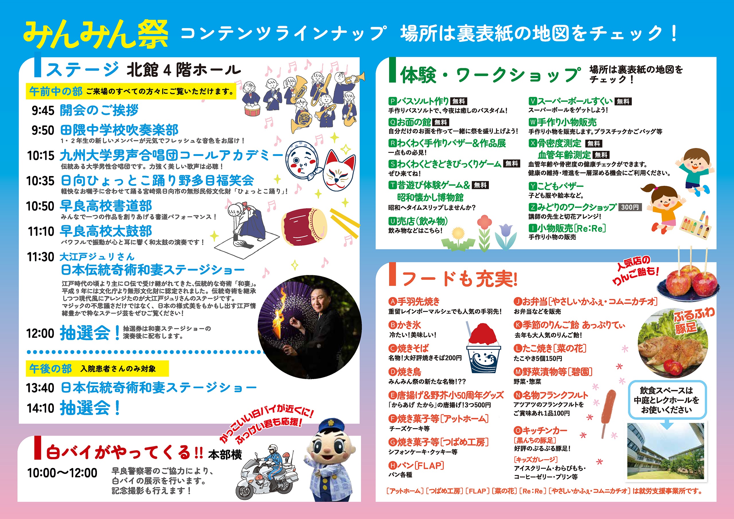 たくさんのステージショーや屋台、健康チェツクやバザー、抽選会なども行っておりますので、次回開催のおりは、ぜひとも遊びに来てください!