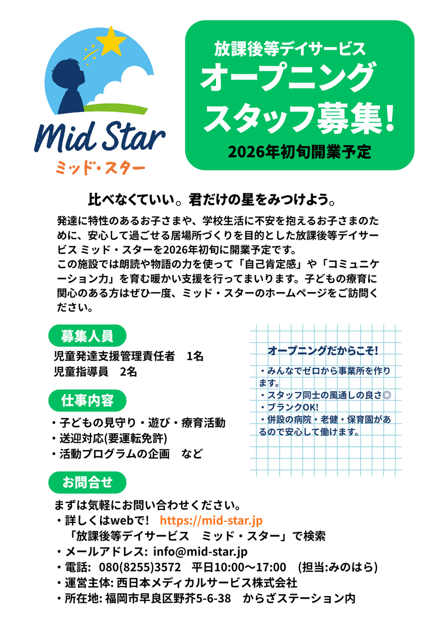 現在、ミッド・スターでは開業のため児発管、児童指導員を募集しています。
